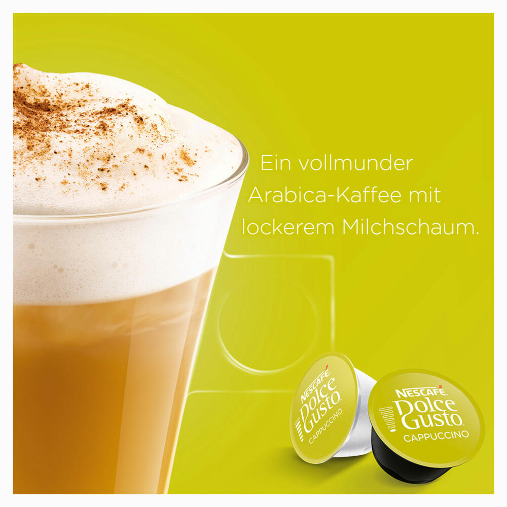 Experience your very own moment of pleasure every day with the NESCAFÉ Dolce Gusto Cappuccino. The fine blend of full-bodied coffee and fluffy milk foam makes the NESCAFÉ Dolce Gusto Cappuccino so unique. The combination of the two exquisite components creates a unique taste experience that will delight you. Thanks to the composition of coffee and milk, you can enjoy the cappuccino all day long and take your own individual moments of pampering. The two layers of milk and coffee are surrounded by a blanket of milk foam and offer you unique coffee enjoyment. Spoon the milk foam directly or stir the individual layers together to create a creamy coffee experience. If you like, refine the NESCAFÉ Dolce Gusto Cappuccino with sweet cocoa powder and create your own individual favorite drink. Choose the cappuccino capsules and bring the experience of a visit to a café home with you.