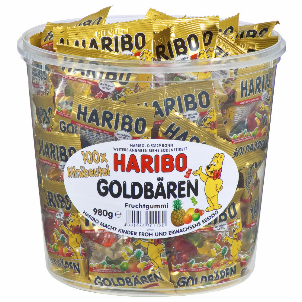 Haribo Goldbären, Gummibärchen, Weingummi, Fruchtgummi, 100 Minibeutel, 980g Dose: