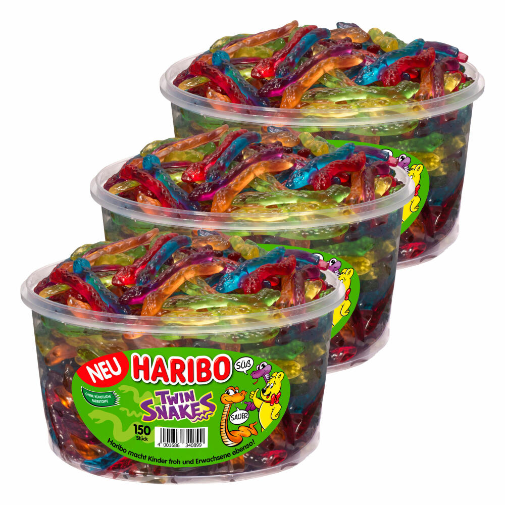 Haribo Twin Snakes, 3er Set, Gummibärchen, Weingummi, Fruchtgummi, 150 Stück, Dose, 1200 g