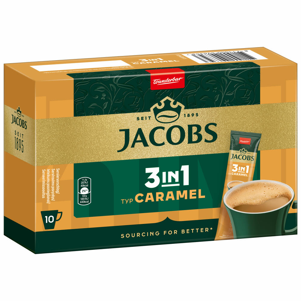 Jacobs 3in1 löslicher Kaffee, Typ Caramel, Karamell Kaffeegetränk, Instantkaffee, 10 Becherportionen
