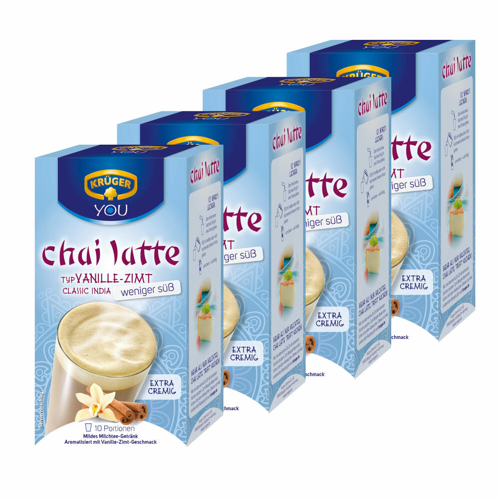 Krüger Chai Latte Classic India weniger süß, Vanille-Zimt, mildes Milchtee Getränk, 4er Pack, 4 x 10 Portionsbeutel