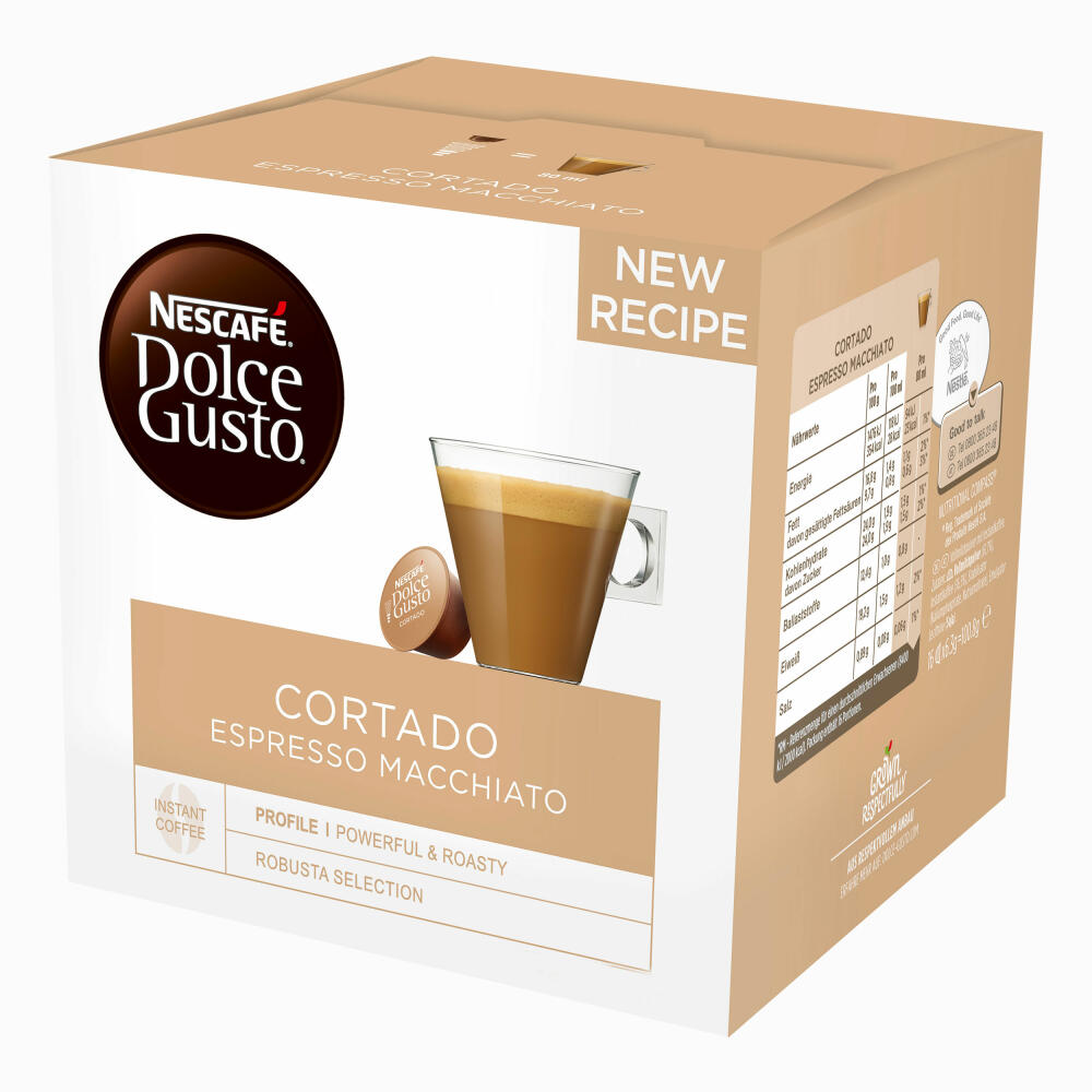 Nescafé Dolce Gusto Cortado Espresso Macchiato Kaffeekapseln: Inspiriert durch eine beliebte Rezeptur aus Spanien ist der aromatische Cortado durch seinen abgerundeten Körper, dem intensiven Geschmack und einer Milchschaumkrone ein wahrer Genuss.