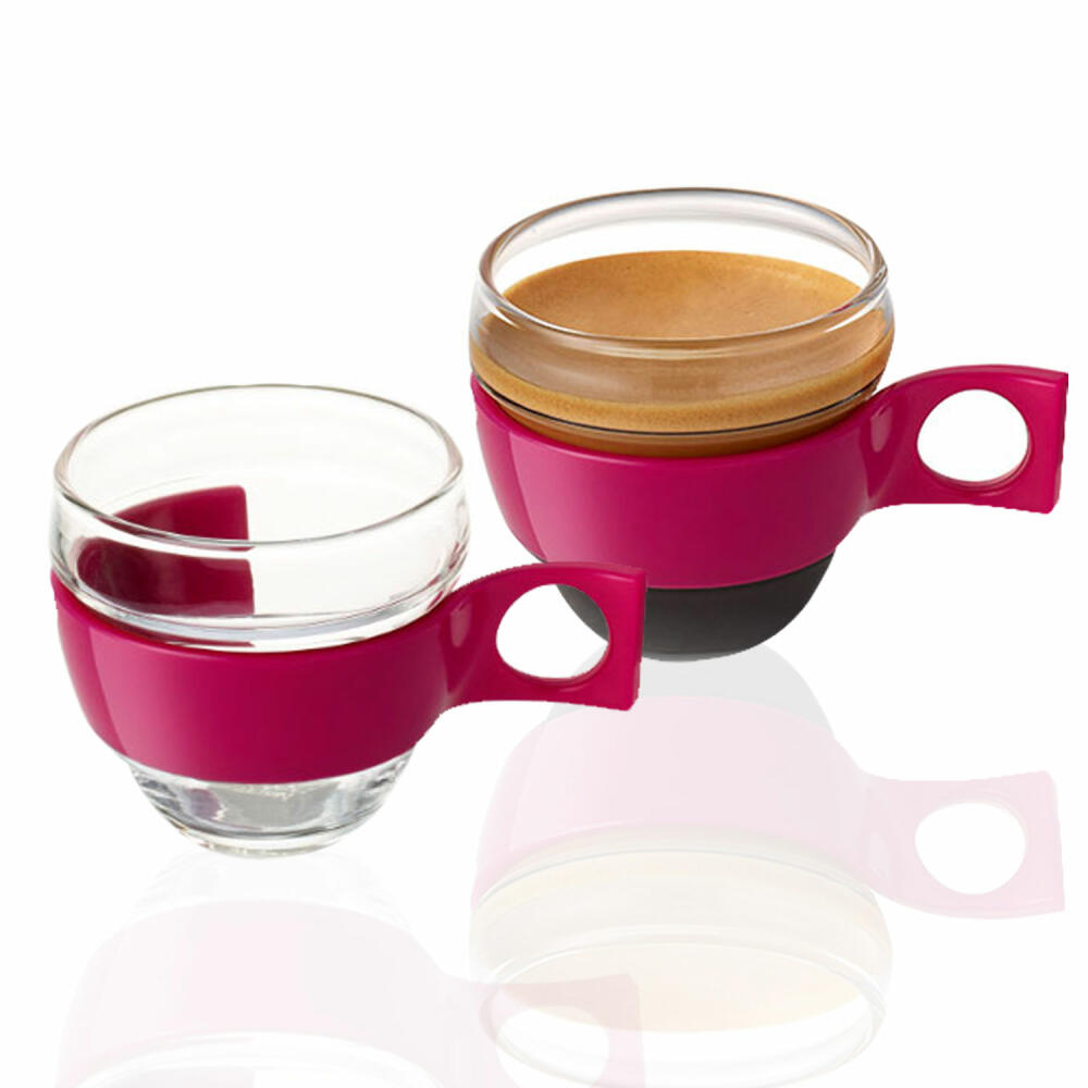 Hier genießt das Auge mit: Dank der Dolce Gusto Espresso Gläser mit kurvig geschwungenem Kunststoffgriff in stylishem Pink wird jeder Espresso-Genuss zum Designerlebnis! Der einzigartige Materialmix aus Glas und Plastik sorgt für ein unvergleichliches Espresso-Erlebnis für alle Sinne. Die Espresso Gläser sind im Doppelpack erhältlich, spülmaschinenfest und bieten Platz für jeweils 60 ml besten Espresso-Genuss. Auch Ihre Gäste werden von den außergewöhnlichen Espresso Gläsern begeistert sein!