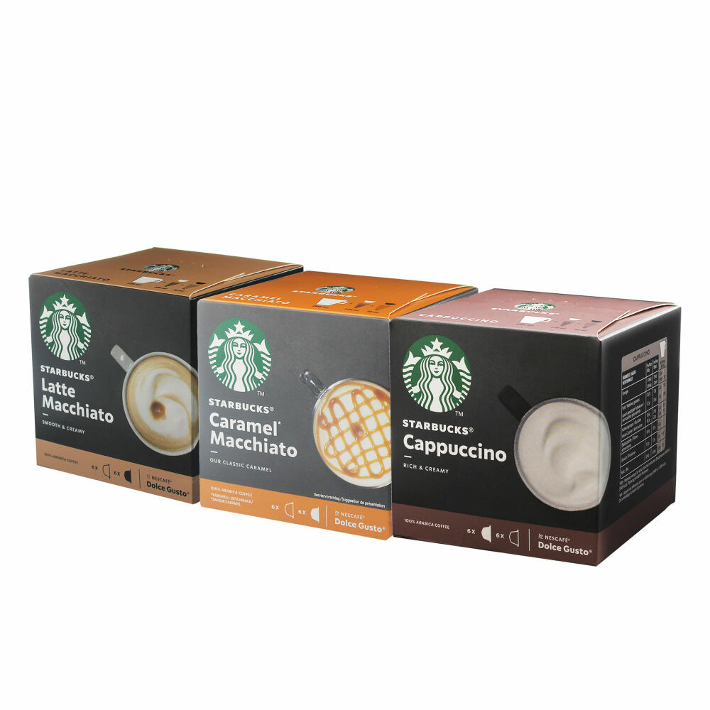 Nescafé Dolce Gusto Starbucks Milchkaffee Set, Cappuccino + Latte + Caramell, 3 Sorten, Kaffee, Kaffeekapseln, 3 x 12 Kapseln